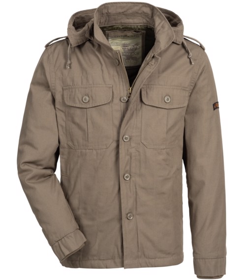 Teplejší látková bunda s podšívkou a kapucí do města i pro výpravy do přírody. Ideální pro jaro a podzim. Opraný vzhled materiálu, střih i použité prvky podtrhující military look.