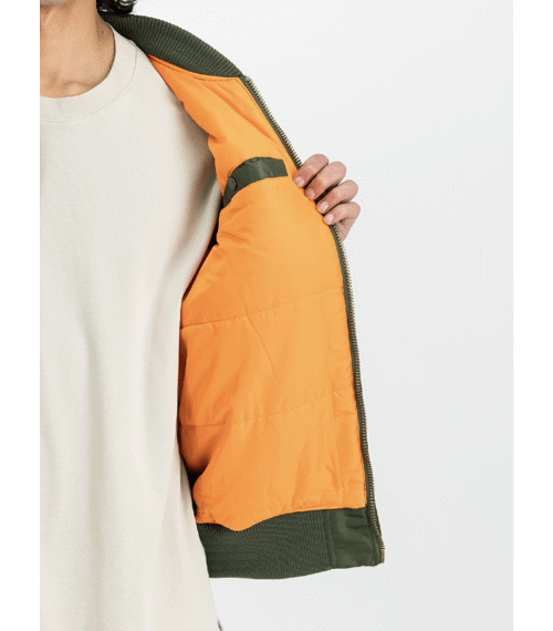 Bunda má klasické zapínání na zip po celé délce, pružný žebrovaný límec, manžety i spodní lem. Na přední straně se nacházejí dvě šikmé kapsy s klopou na druky. Na rukávu je umístěna kapsa se zipem doplněná typickým červeným přívěskem „Remove Before Flight“.
