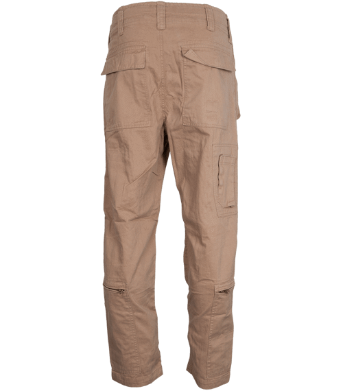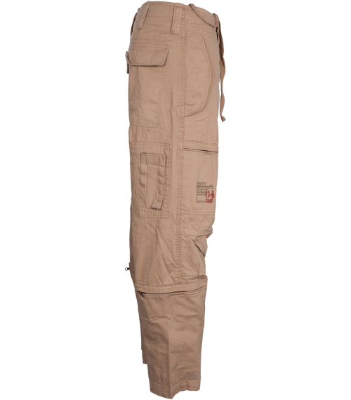 Velký počet kapes: dvě kryté klopami po stranách vpředu, dvě vakové (cargo) vzadu, dvě uzavírané zipem na stehnech vpředu, jedna menší na levém stehně u vnitřního švu (vhodná např. na multifunkční nástroj), další malá kapsa na pravém stehně za bočním švem (např. na nůž, popř. mobilní telefon), poslední dvě kapsy na koncích nohavic z boku (opět uzavírané zipem)